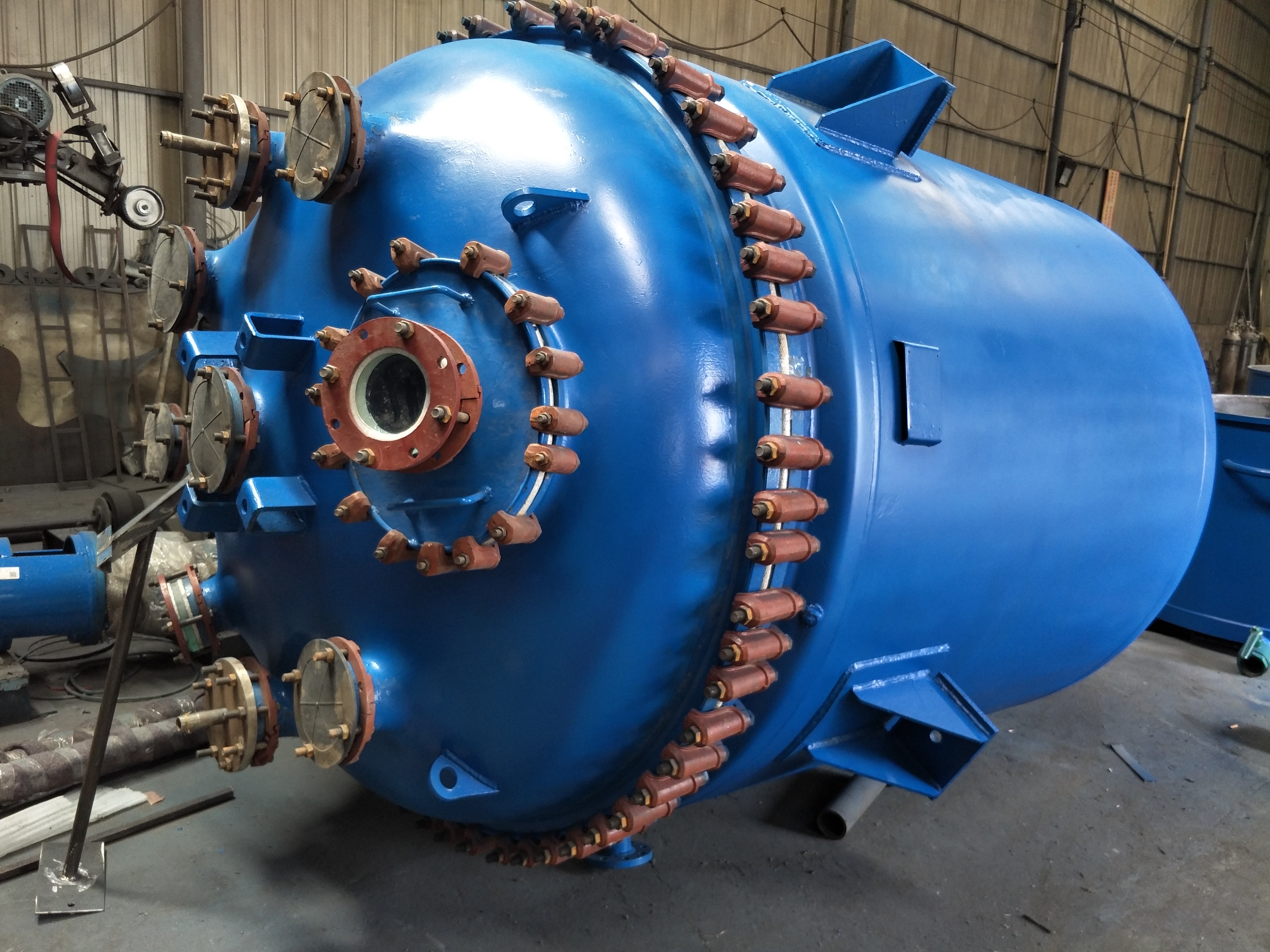 搪瓷反應(yīng)釜主要由搪瓷筒體、夾套、加熱系統(tǒng)、支座、密封、搪瓷攪拌器、各進出管口、驅(qū)動及電控箱等構(gòu)成。
